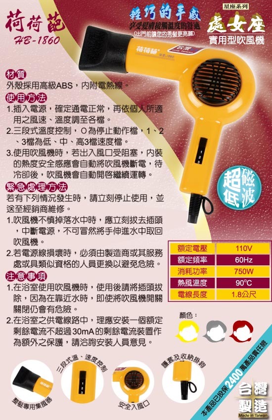 首頁 » 產品展示 » 吹風機 » HB-1860荷荷葩吹風機
