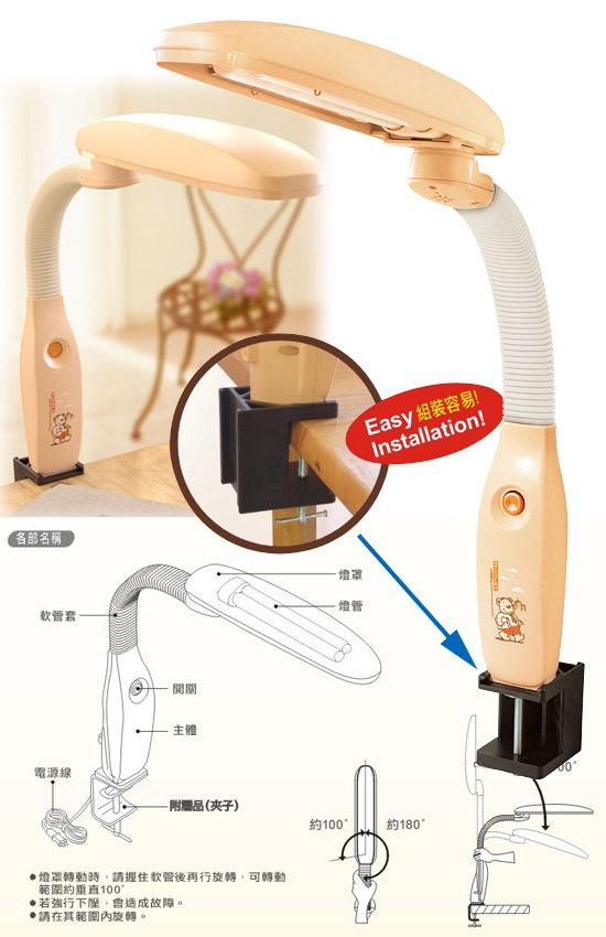 3. 燈罩轉軸可270度旋轉.可任意調整角度, 符合人體工學設計。